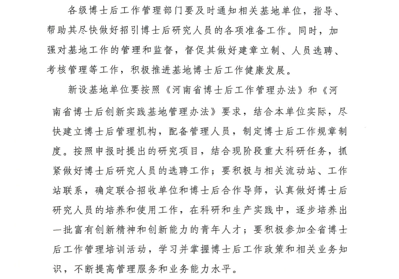 近日,河南省人力资源和社会保障厅正式下发《关于同意黄淮实验室等69个单位备案设立博士后创新实践基地的通知》(豫人社函〔2025〕262号),乔优公司成功通过备案评审获准设立河南省博士后创新实践基地。这一省级科研平台的获得,不仅是乔优公司在高层次人才平台建设方面取得的重大突破,更是企业科研创新实力获得认可的重要体现。