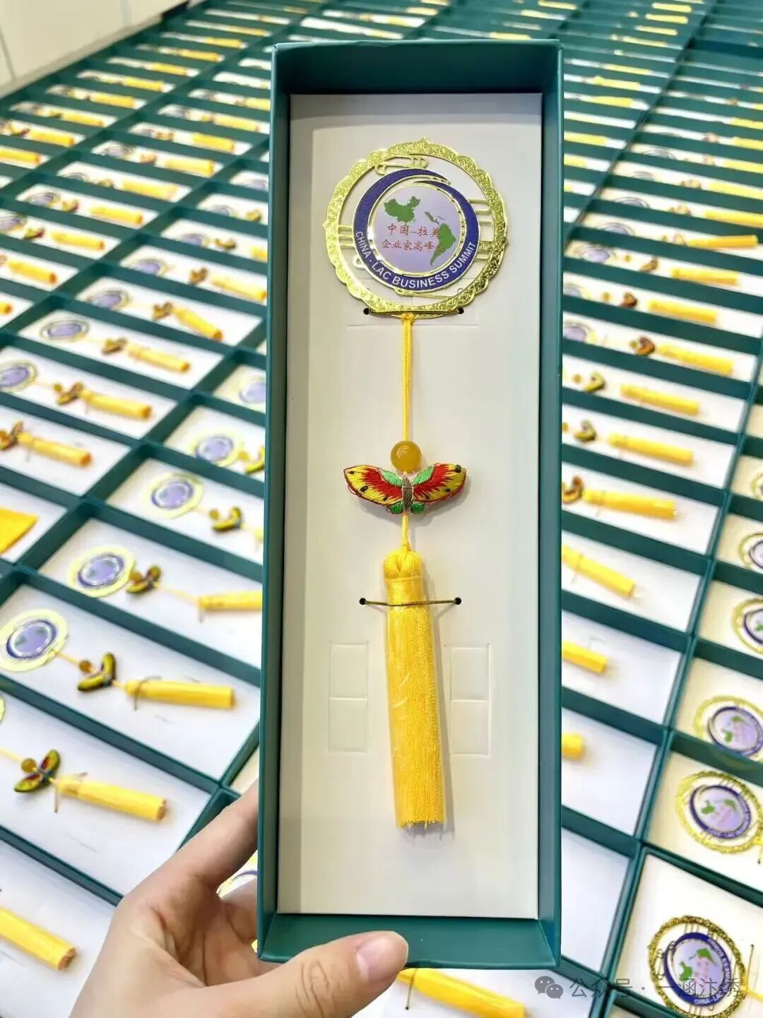 此次为高峰会精心打造的手工汴绣书签,每一枚均为一涵绣娘手工精心绣制。书签纹样细腻、色彩雅致,深度融汇传统汴绣技艺精髓,巧妙融入第十八届中国—拉美企业家高峰会专属图案与标识,并配以手工刺绣蝴蝶结流苏穗,既彰显现代审美,又饱含“福气绵长”的美好寓意,堪称融实用、审美与收藏价值于一体的艺术珍品。