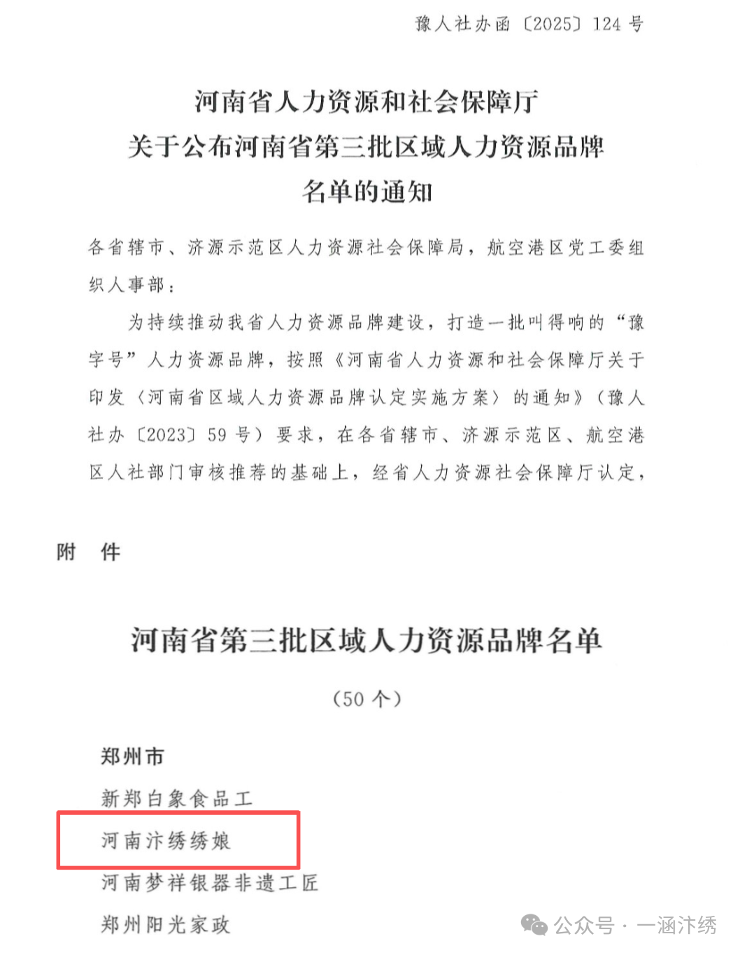 近日,河南省人力资源和社会保障厅公布第三批河南省区域人力资源品牌认定结果,一涵汴绣申报的“河南汴绣绣娘”成功入选,成为全省50个省级区域人力资源品牌之一。