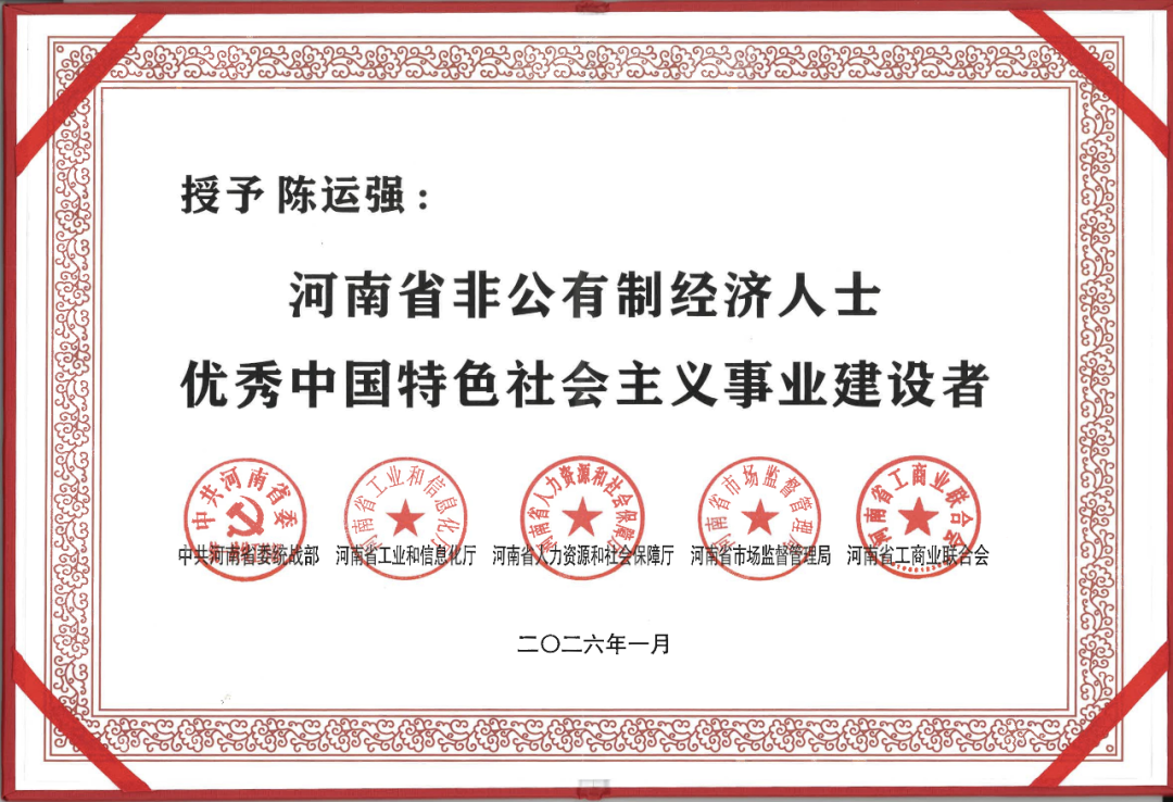 近日,中共河南省委统战部、省工业和信息化厅、省人社厅、省市场监管局、省工商联联合发布表彰决定,授予100名非公有制经济领域杰出代表“河南省非公有制经济人士优秀中国特色社会主义事业建设者”称号。我会常务理事、河南省北斗科技有限公司总经理陈运强光荣入选。