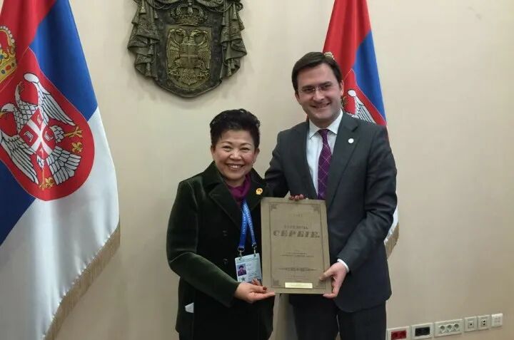 2014年 怡海集团第一时间向塞尔维亚巴尔干半岛遭受暴雨洪灾的当地居民捐款 图为时任塞尔维亚司法部长、现任塞尔维亚文化部长尼古拉·塞拉科维奇向王琳达主席颁授感谢信