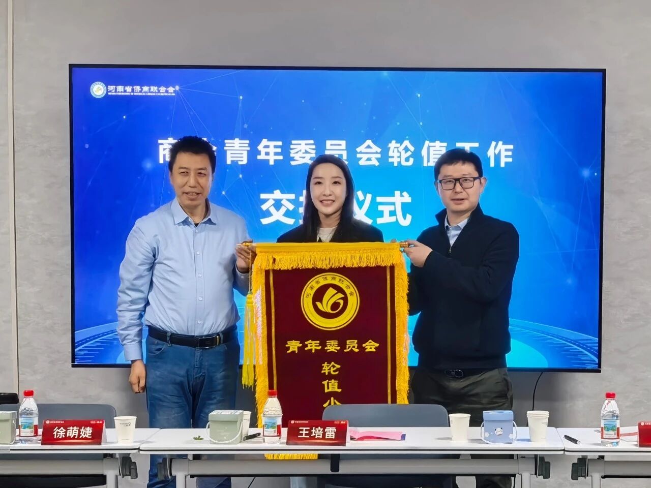 随后,会议举行了青年委员会轮值主任交接仪式,新任轮值主任胡淇皓、李嘉怡从上一任青委会轮值主任梁斌手中接过象征责任与创新的接力棒,标志着商会青年力量的传承与启航。
