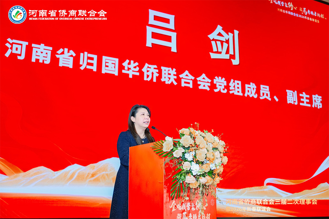 河南省侨联党组成员、副主席吕剑总结发言。她代表省侨联向活动的成功举办表示热烈祝贺,并向广大侨商朋友致以新春问候。吕剑副主席高度肯定了省侨商会2025年的工作成效,称赞商会新一届班子展现出团结务实高效的新风貌,尤其是“豫侨优选”平台成为侨商工作的“新名片”。展望2026年“十五五”规划开局之年,她提出三点希望:希望大家同心同德,投身现代化河南建设;携手前行,让 “豫侨优选” 等平台绽放更耀眼光芒;凝心聚力,将商会打造成有温度的团结之家。省侨联将一如既往为侨商在豫发展提供更优服务与有力支持。