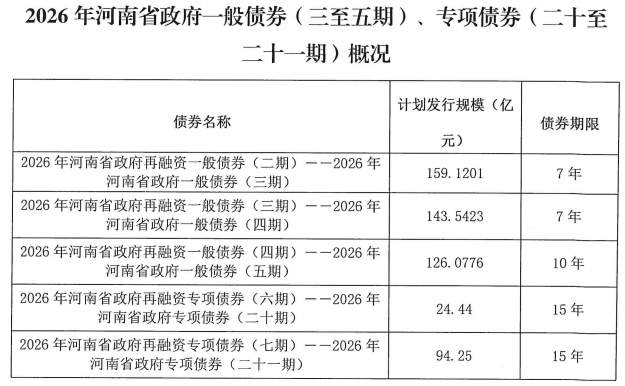 大河财立方消息,3月25日,河南省财政厅披露信息,经河南省人民政府同意,决定发行2026年河南省政府一般债券 (三至五期)、专项债券 (二十至二十一期)。